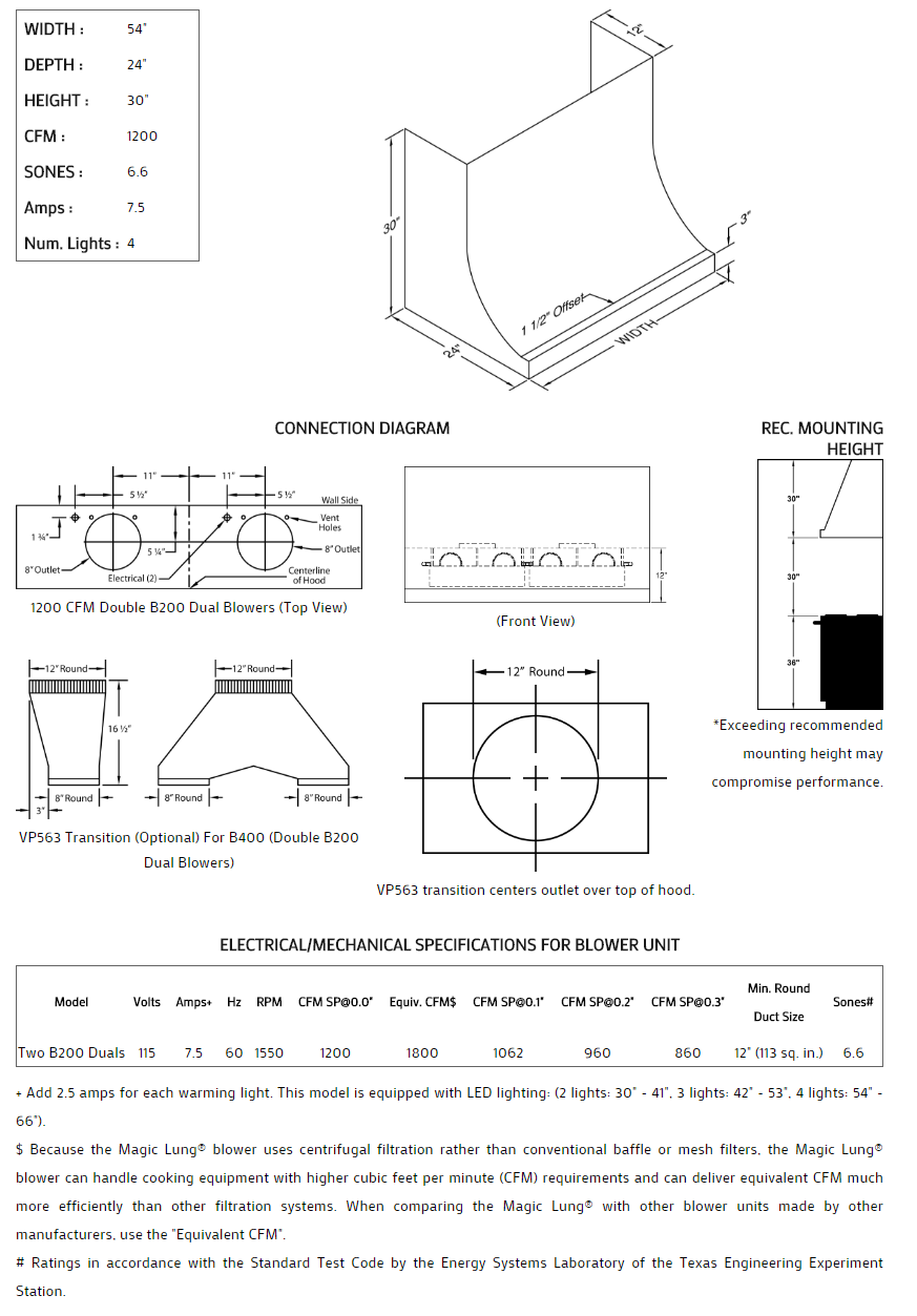 54" Vent-A-Hood Premier Magic Lung Professional/Standard Wall Mounted DAH30454SS