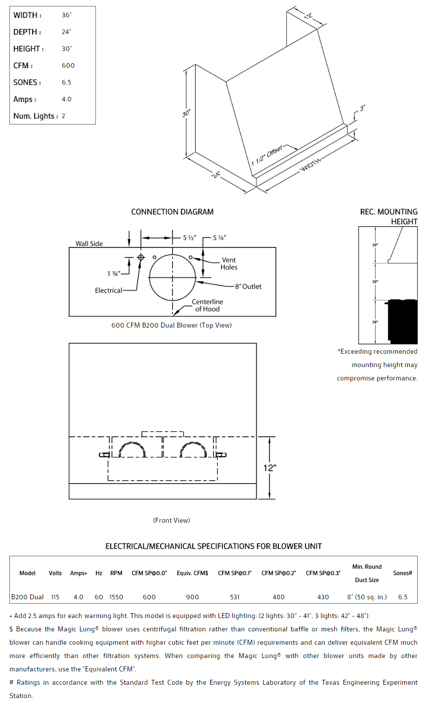 Features clean slope and defined front end. Heat lamps may also be added to selected models. Click on the models for a list of our base model numbers for standard sizes; simply select the model you need, and then specify the finish (painted, stainless steel, real brass, real copper, or hammered copper). Recommended mounting height is 30" above the cooking surface. All Vent-A-Hood products are suitable for use in damp locations (outdoor applications such as a covered patio) when installed in a GFCI protected branch circuit.