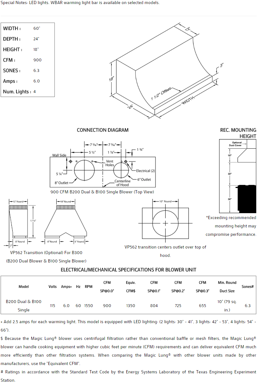 Classic design of this wall mount fits any kitchen. Choose vertical ends that are perfect for installation between cabinets, or concave ends for a French Country look. Heat lamps may also be added to selected models. Click on the models for a list of our base model numbers for standard sizes; simply select the model you need, and then specify the finish (painted, stainless steel, real brass, real copper, or hammered copper). Recommended mounting height is 30" above the cooking surface. Matching wall mount duct covers (sold separately) are available in standard sizes for 8', 9', and 10' ceiling heights or in custom sizes. All Vent-A-Hood products are suitable for use in damp locations (outdoor applications such as a covered patio) when installed in a GFCI protected branch circuit.