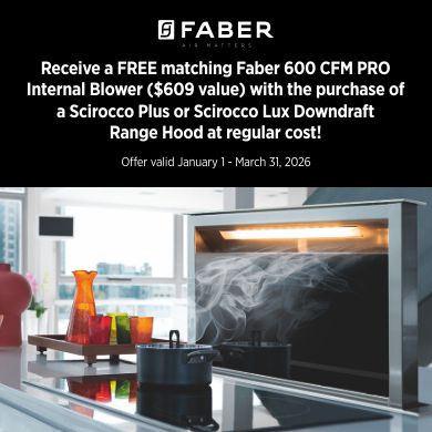 Receive a FREE matching Faber 600 CFM PRO Internal Blower ($609 value) with the purchase of a Scirocco Plus or Scirocco Lux Downdraft Range Hood at regular cost!