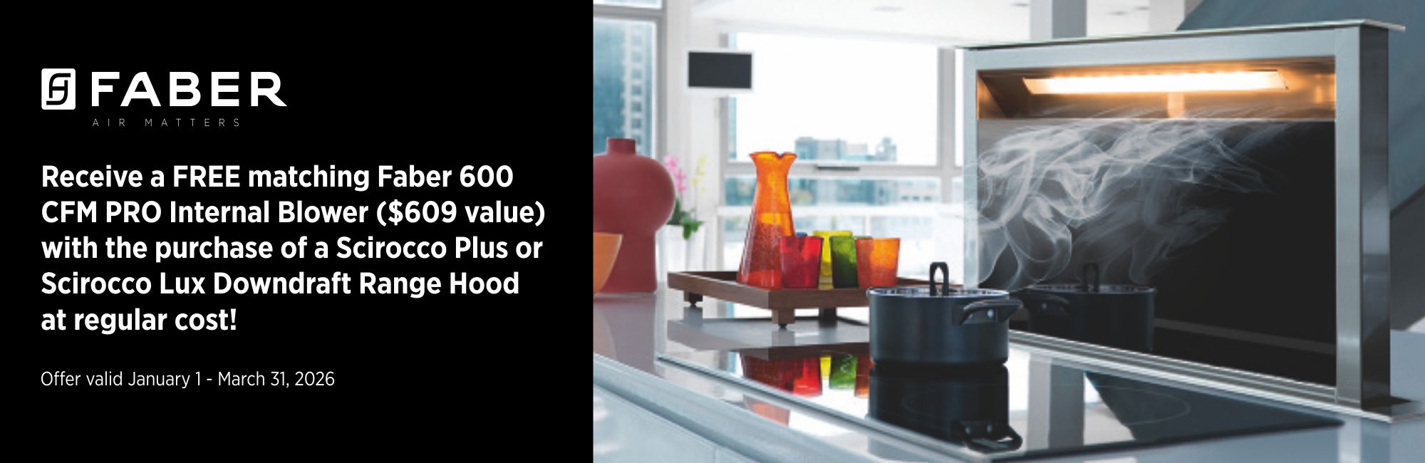 Receive a FREE matching Faber 600 CFM PRO Internal Blower ($609 value) with the purchase of a Scirocco Plus or Scirocco Lux Downdraft Range Hood at regular cost!